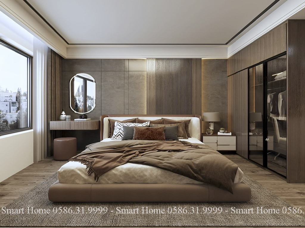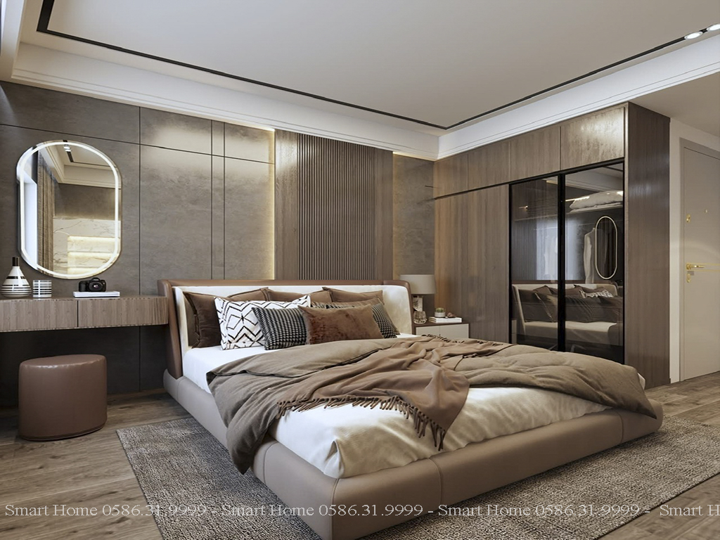 Phòng ngủ sử dụng bố cục cân đối và mạch lạc, với giường ngủ đặt chính giữa, tường đầu giường được thiết kế đặc biệt bằng các tấm ốp lam gỗ kết hợp vật liệu giả bê tông, mang đến chiều sâu và cá tính cho không gian.