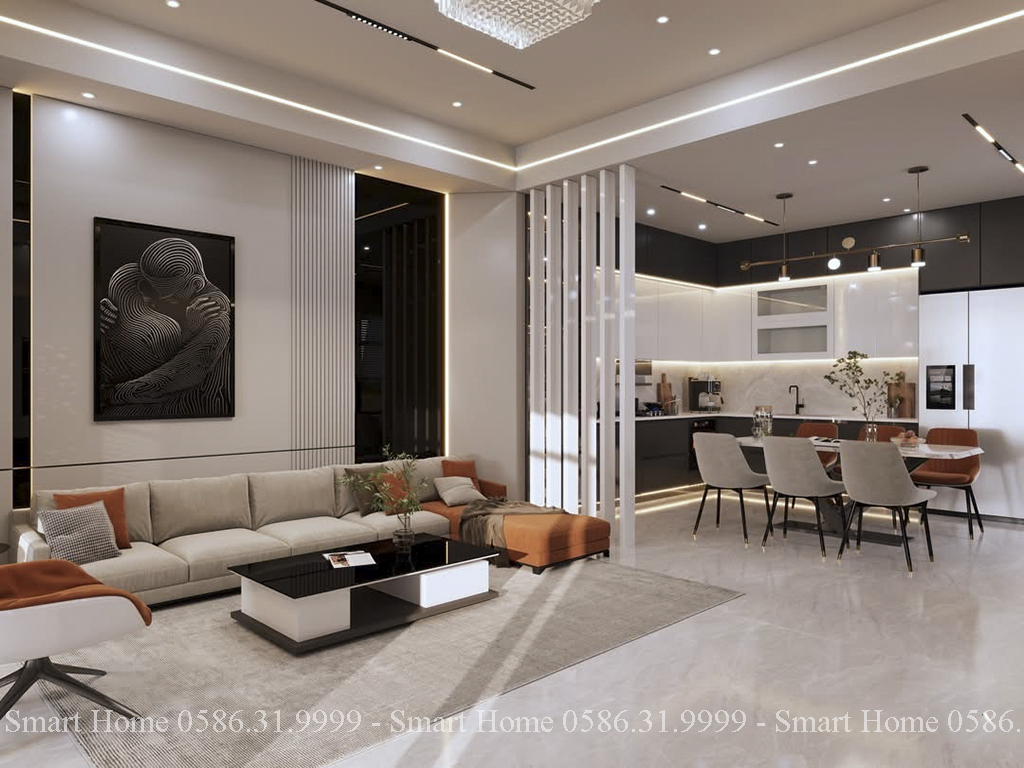 Không gian được thiết kế mở hoàn toàn, kết nối liền mạch giữa phòng khách, khu bàn ăn và góc bếp – mang lại cảm giác rộng rãi, thoáng đãng và tràn ngập ánh sáng tự nhiên. Vách lam trắng ngăn nhẹ giữa các khu vực, vừa tạo phân tách tinh tế, vừa không làm mất đi sự liên kết chung.